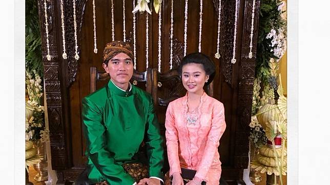 Sementara itu Kaesang tampil dengan pakaian adat khas Jawa warna hijau lengkap dengan blangkon yang menghiasi kepalanya.