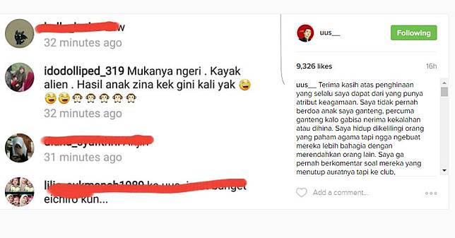 Anak komedian Uus ini dikatai mirip alien oleh warganet @idodolliped_319.