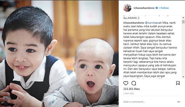 Belum lama ini, unggahan foto putra pasangan Alyssa Soebandono dan Dude Harlino, Muhammad Dirgantara Ariendra Harlino, di Instagram @ichasoebandono mendapatkan komentar negatif. Disebutkan bahwa gigi Rendra jelek seperti ibunya. Alyssa pun membalas komentar itu dengan bijak.