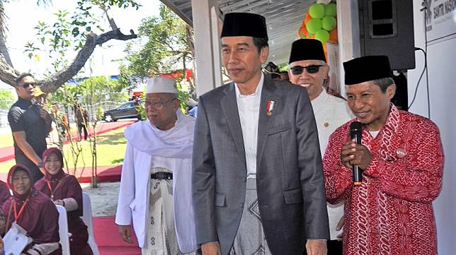 | Presiden Joko Widodo didampingi Ketua MUI KH Maruf Amin (kiri), meninjau lokasi Bank Wakaf Mikro Tanara di Serang, Banten, Rabu (14/3). [Antara] |