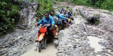 Menyusuri jalan setapak di rimba belantara bukanlah kegiatan yang menyenangkan, jalan ini yang dilalui tidak jarang terbenam longsoran atau dipenuhi lumpur. Ini yang membat perjalanannya semakin panjang.