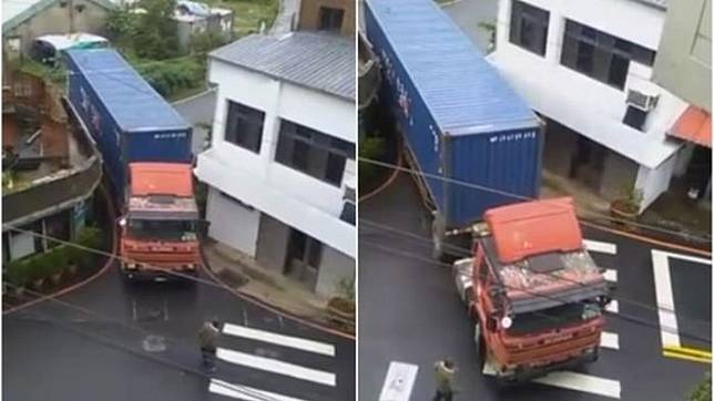 | Akun Facebook 爆料公社 mengunggah cuplikan video yang memperlihatkan bagaimana cara truk container ini lolos dari jalan sempit di antara dua rumah. |